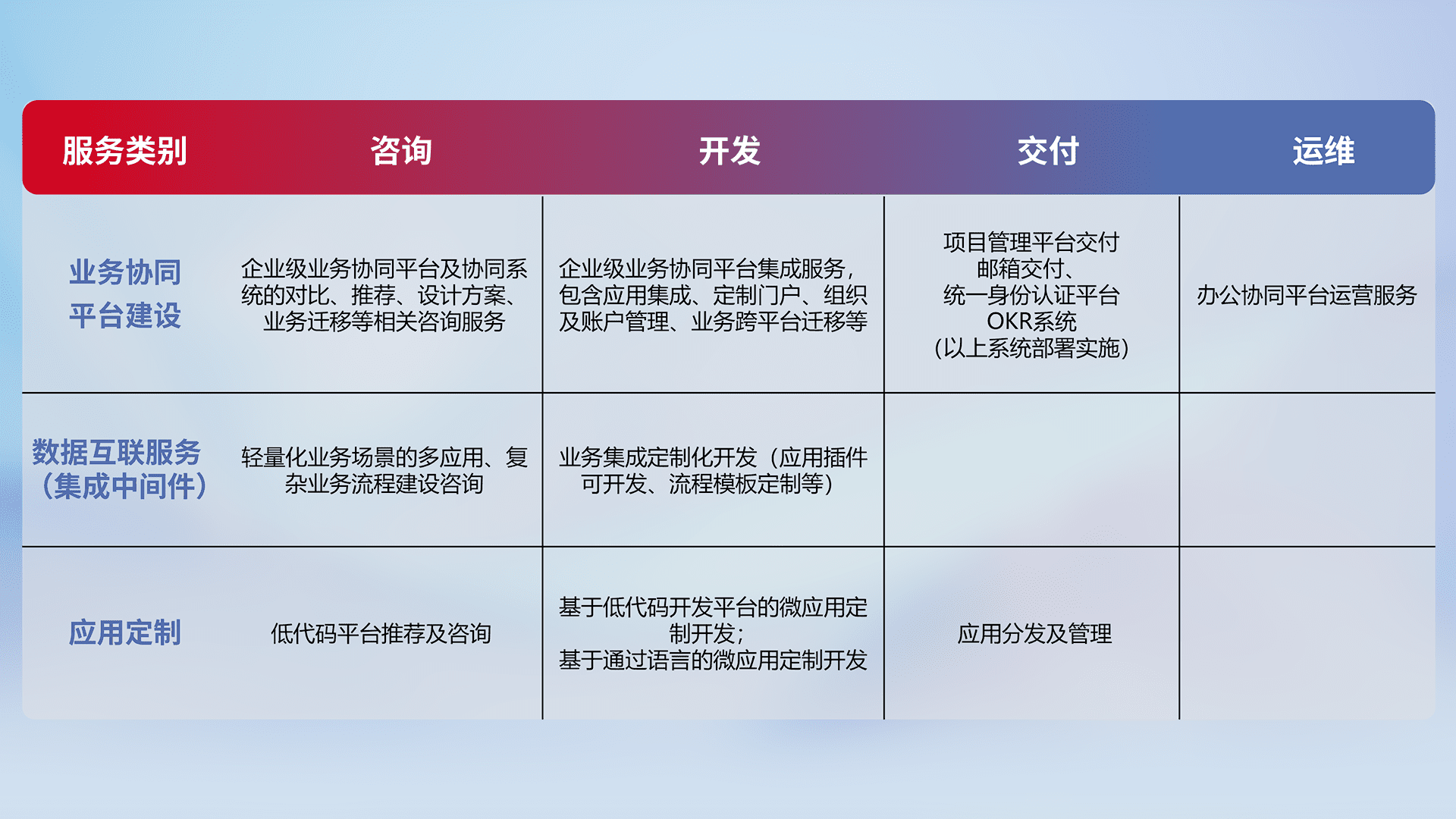针对钉钉、、、企微、、、IDaas等平台级产品提供产品的规划、、、方案、、、交付、、、、定制化开发等服务,,实现如统一协同办公、、、、智能客户服务、、、、混合会议管理、、、智能数据查询、、、、等业务场景,,,,实现数字化转型。。